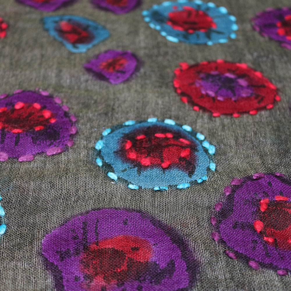 Dipingere a mano i tessuti è una delle più antiche e preziose tecniche dell’artigianato indiano, tramandata da generazioni di abili artigiani. Si utilizzano pennelli e colori naturali e ogni sciarpa viene decorata manualmente, con disegni che prendono vita direttamente sulla stoffa. Questo processo richiede una maestria notevole: le linee delicate e le sfumature precise creano motivi intricati che celebrano ogni anno una ispirazione diversa..