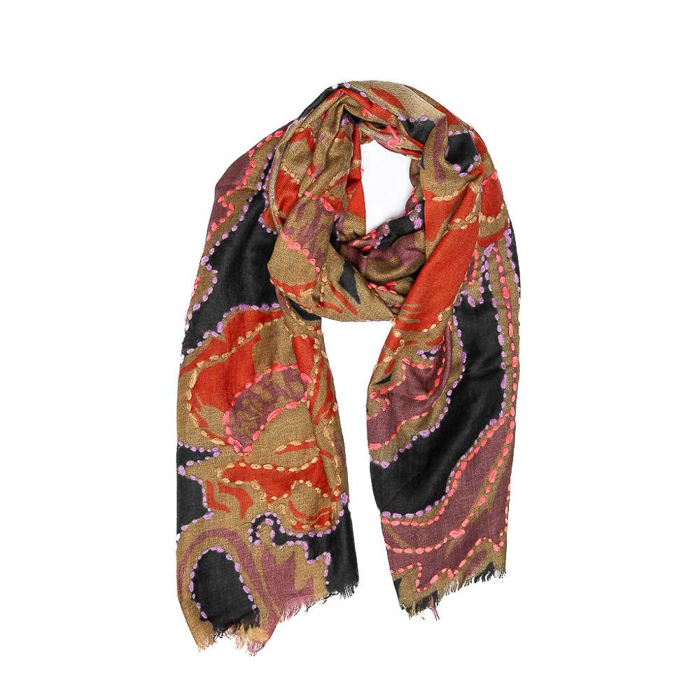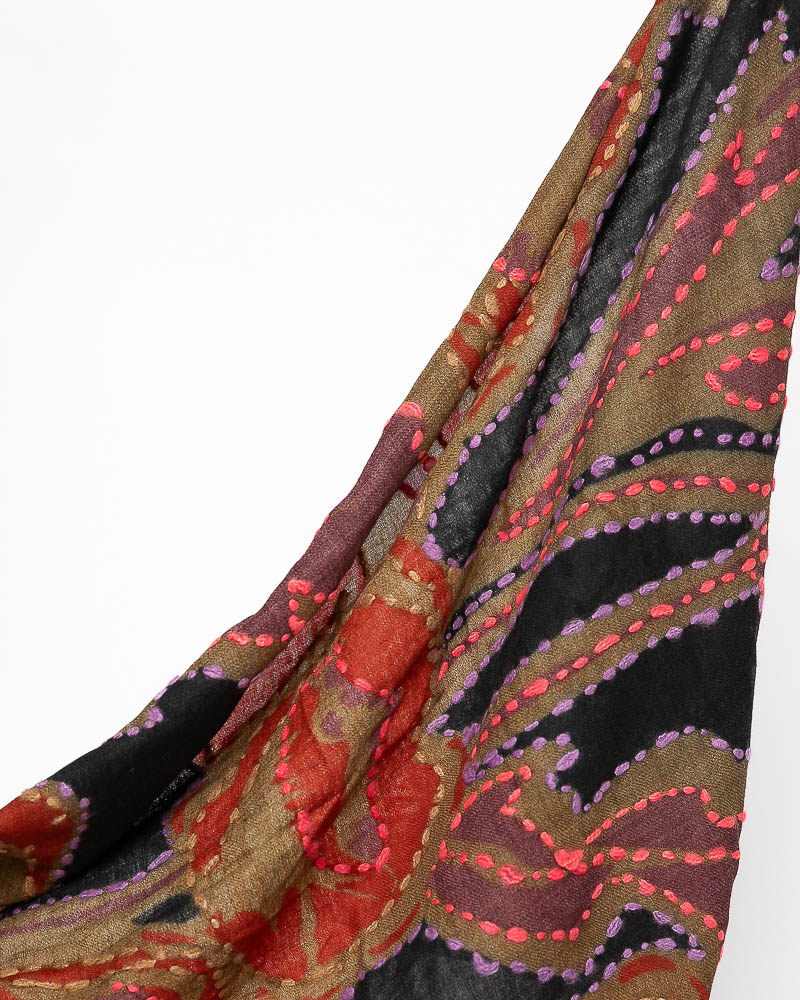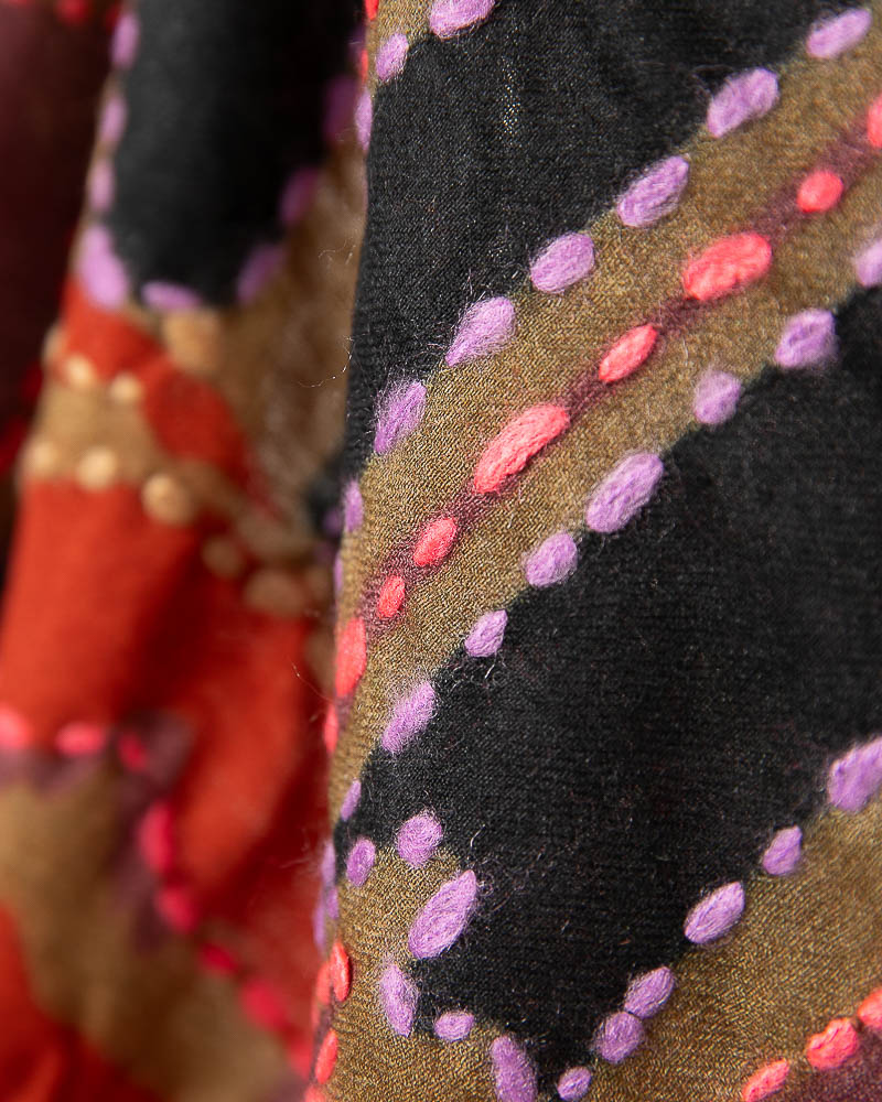 Sciarpa in soffice lana twill ricamata a mano, disegno macro floreale arricchito dal contrasto di colori dei peculiari ricami.