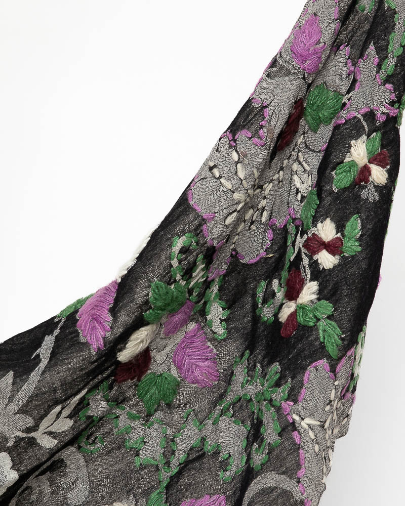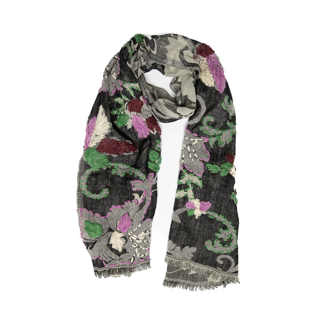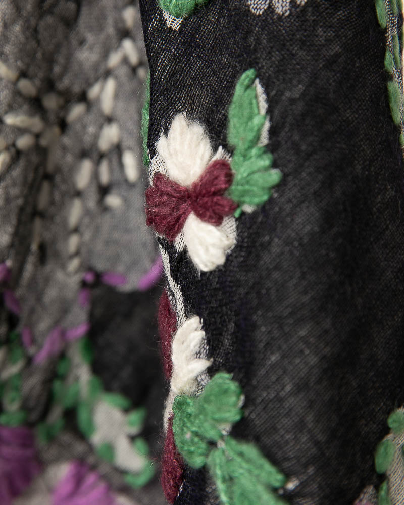 Sciarpa in soffice lana merino lavorata a telaio jacquard ed impreziosita da disegni floreali interamente ricamati a mano, l’intera decorazione artigianale ne esalta l’unicità e la rende un capo senza tempo.