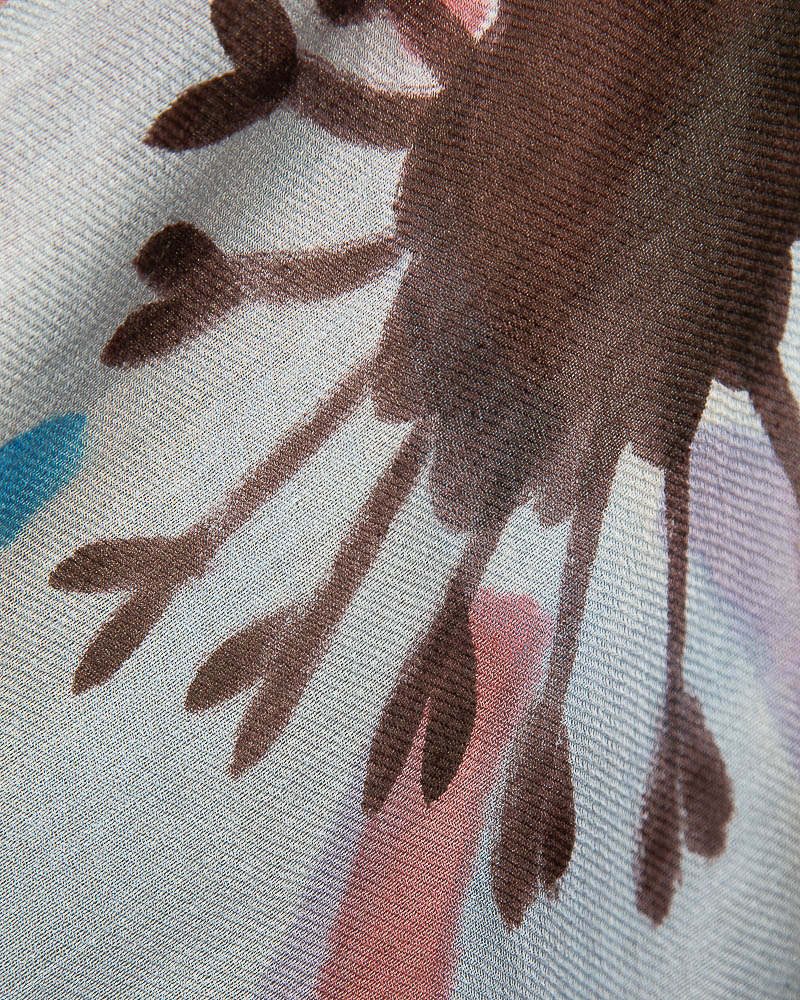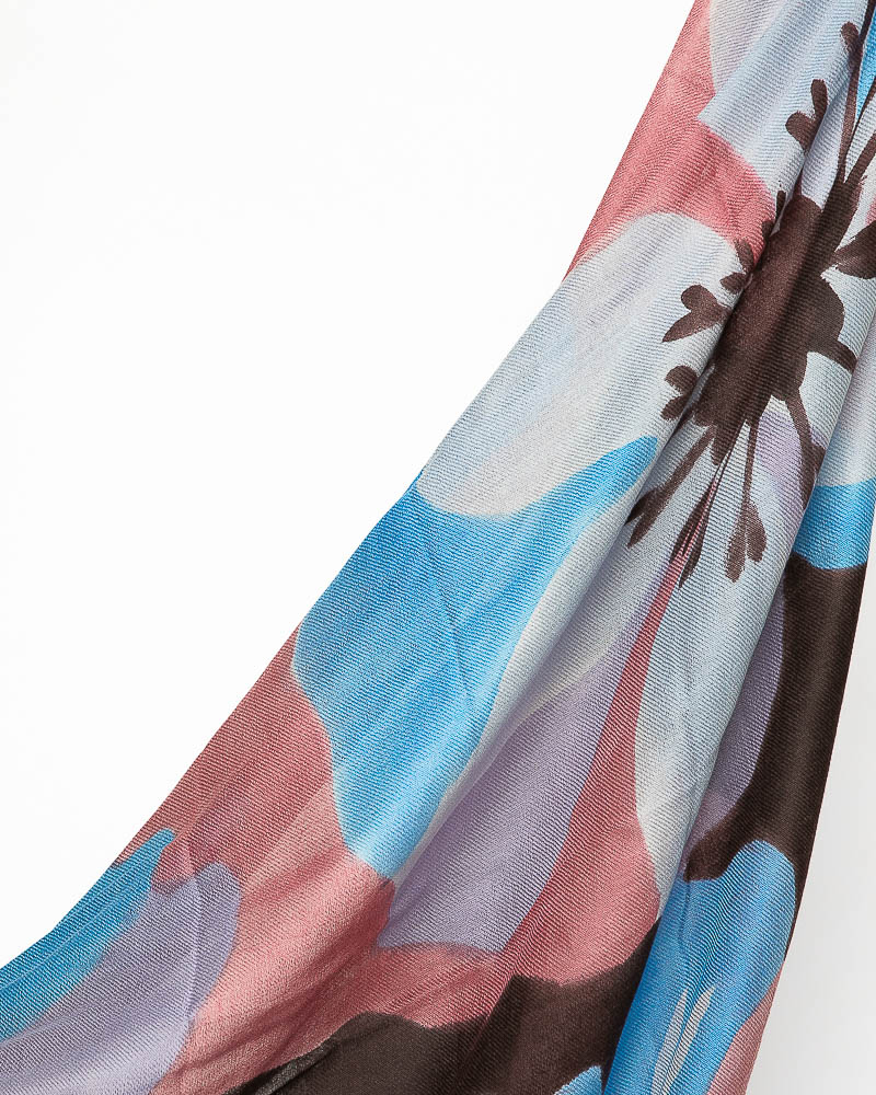 Sciarpa in modal e lana morbidissima, interamente dipinta a mano con disegno macro floreale, adatta anche per le temperature più miti, un’ottima alternativa per chi ha sensibilità cutanea al contatto con la pura lana. Il modal, fibra naturale derivata dal legno di faggio, è molto più resistente ai lavaggi e garantisce la  longevità dei capi.