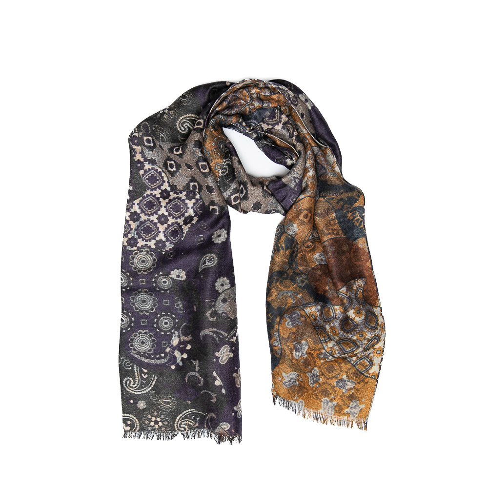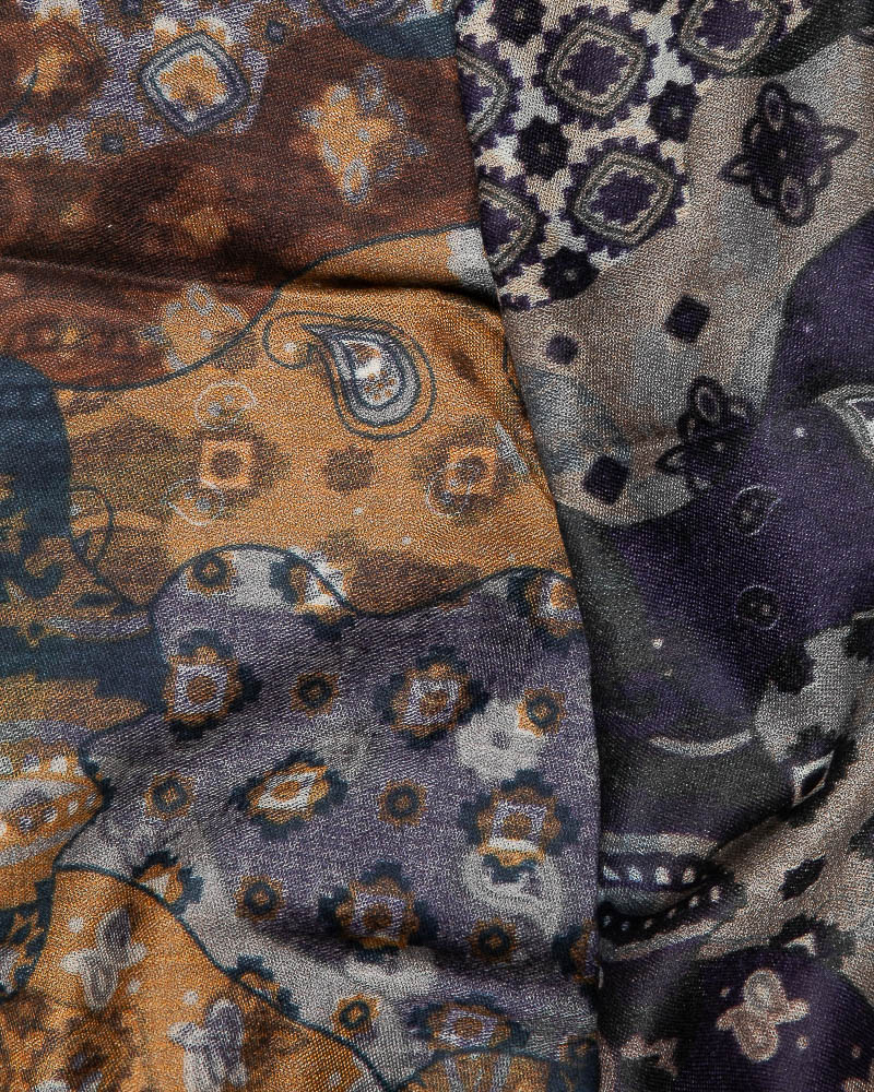 Esclusiva sciarpa dal design double-face. Da un lato fondo blue con macro fantasia patch , dall’altro fondo biscotto con macro fantasia vintage.