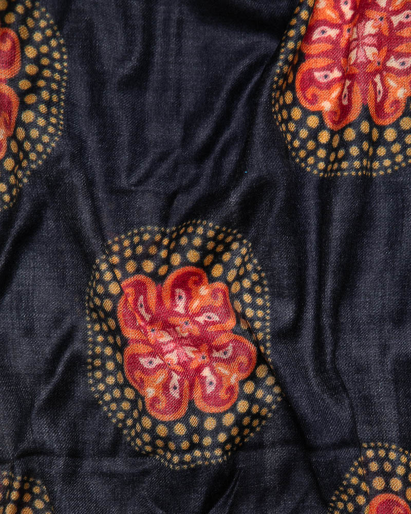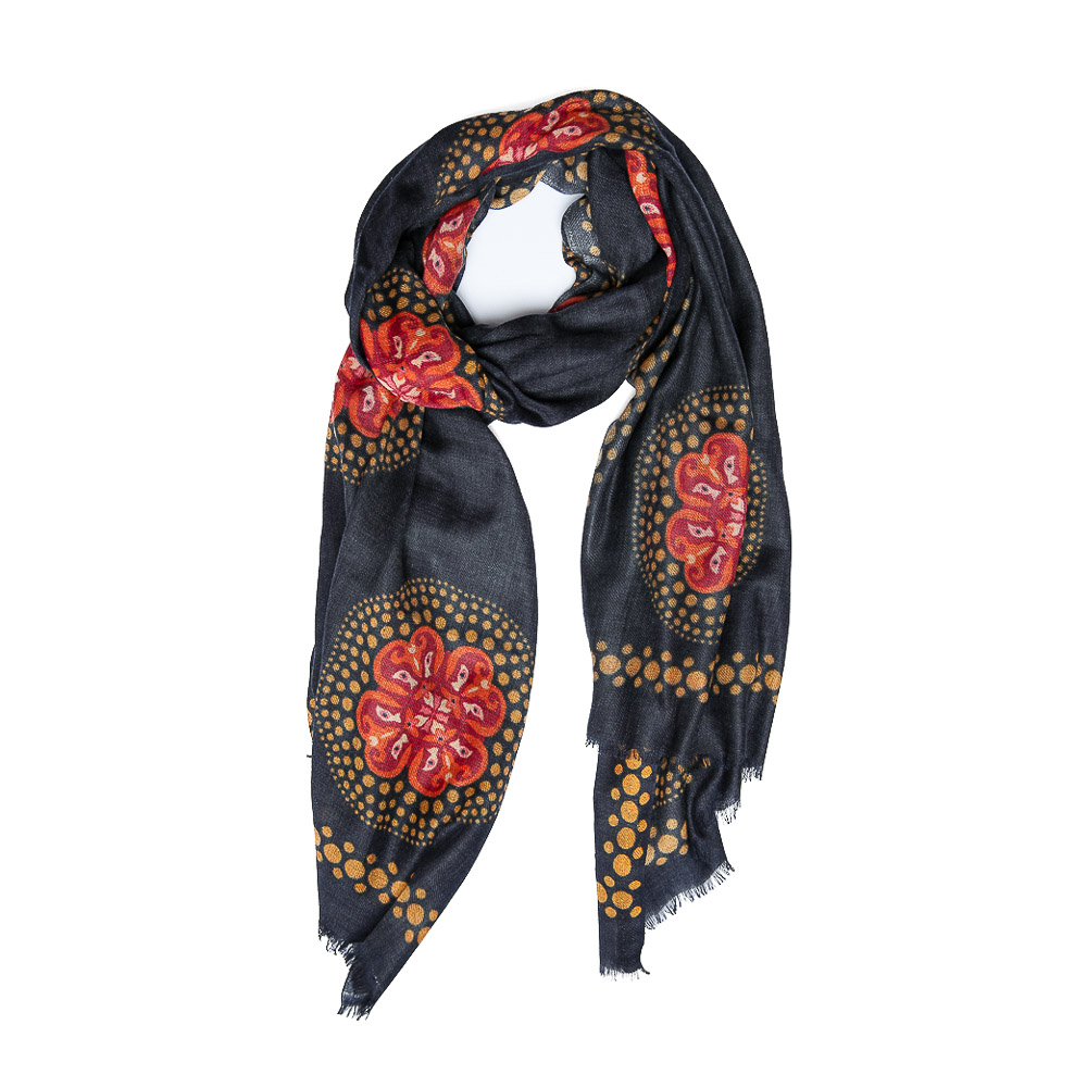 Sciarpa in soffice lana twill con con stampa floreale incorniciata da piccole bolle in contrasto colore.