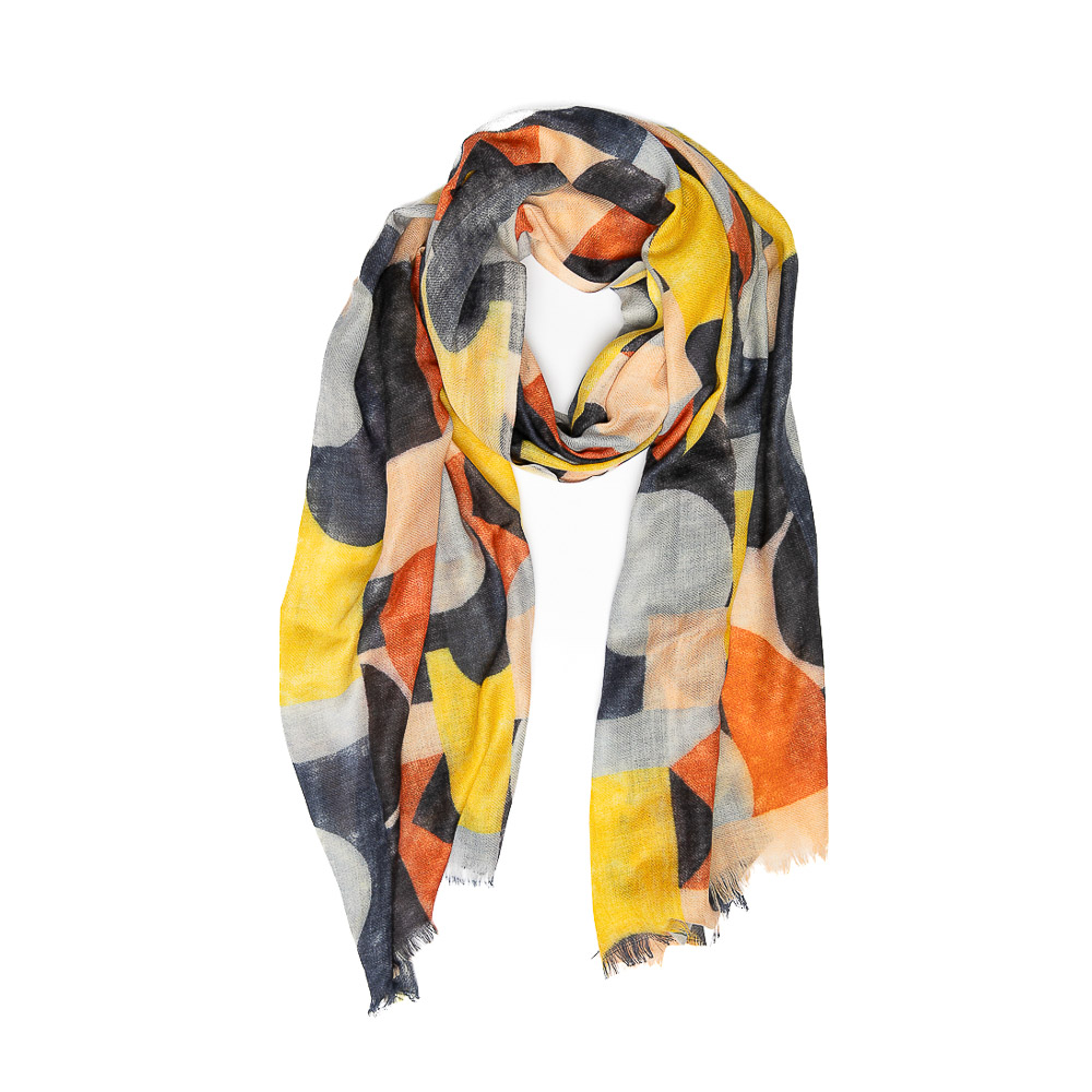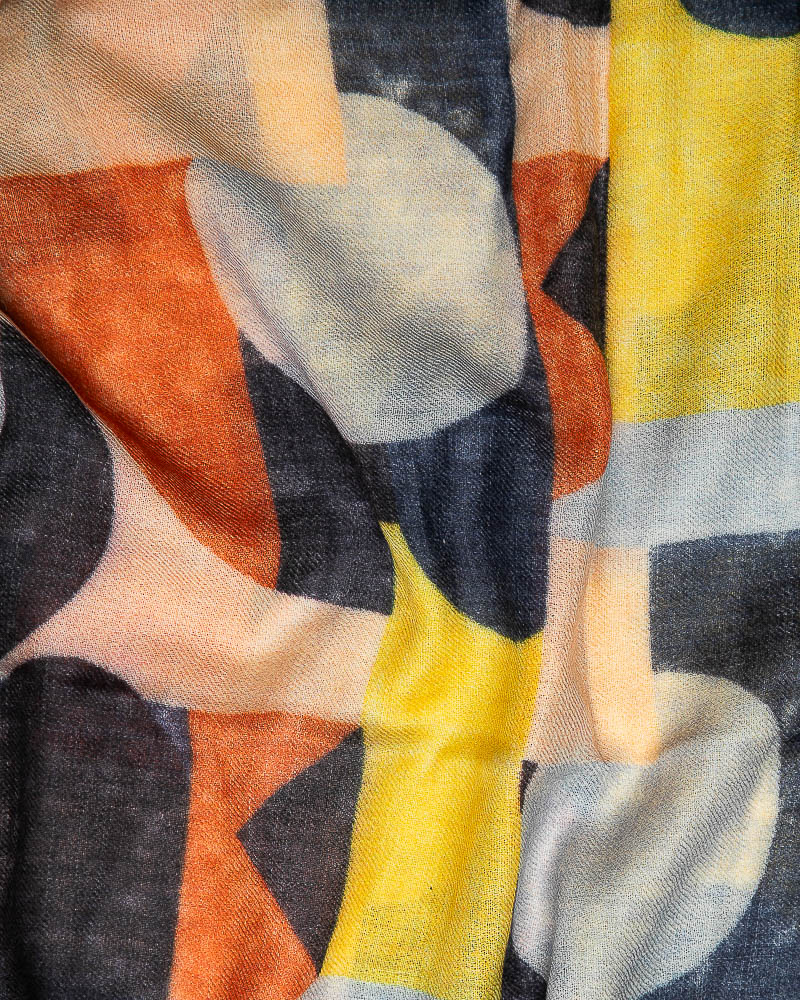 Sciarpa in soffice lana twill con disegni geometrici anni ’70, dalle particolari sfumature di colore.