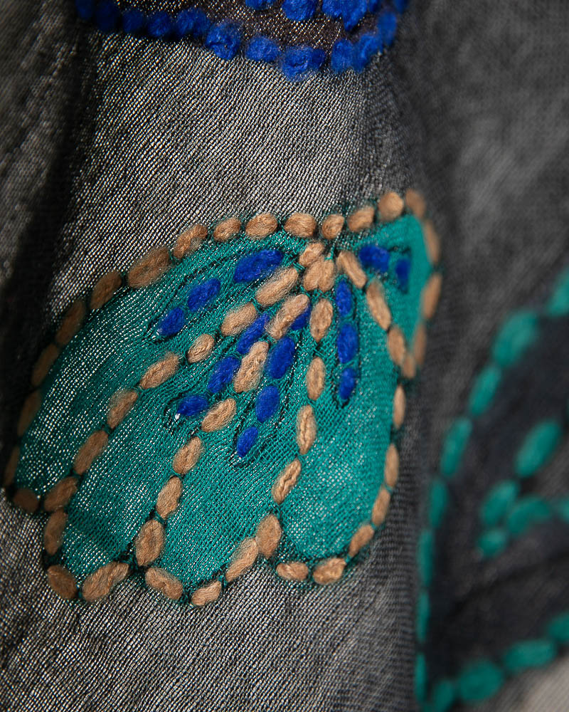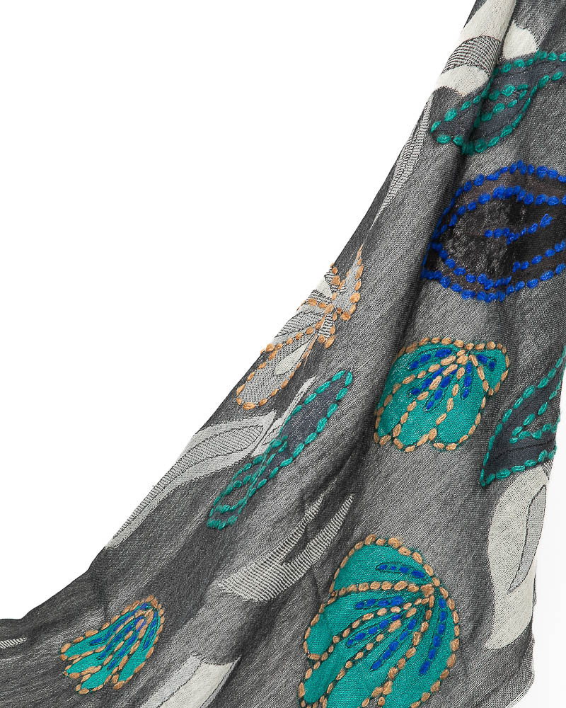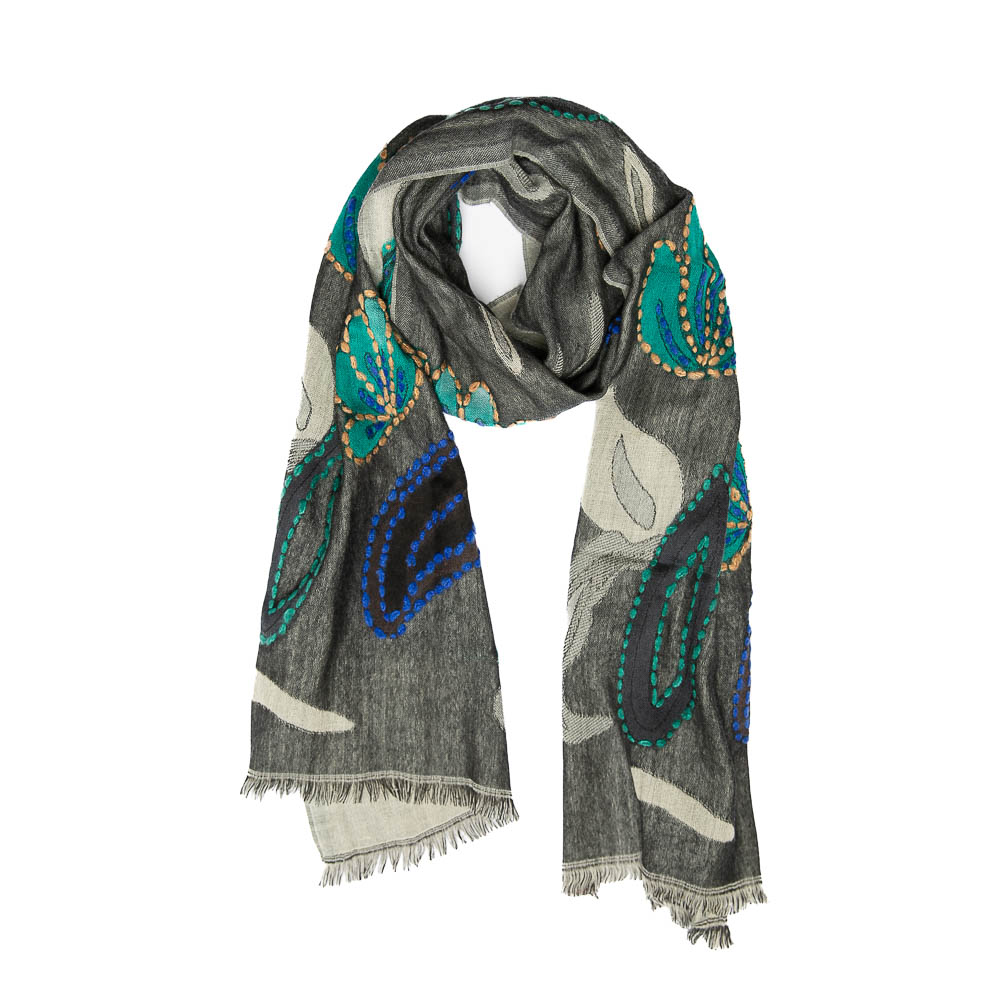 Sciarpa in soffice lana merino lavorata a telaio jacquard ed impreziosita da disegni floreali interamente dipinti e ricamati a mano, l’intera decorazione artigianale ne esalta l’unicità e la rende un capo senza tempo.