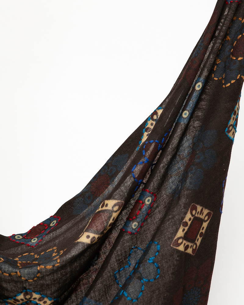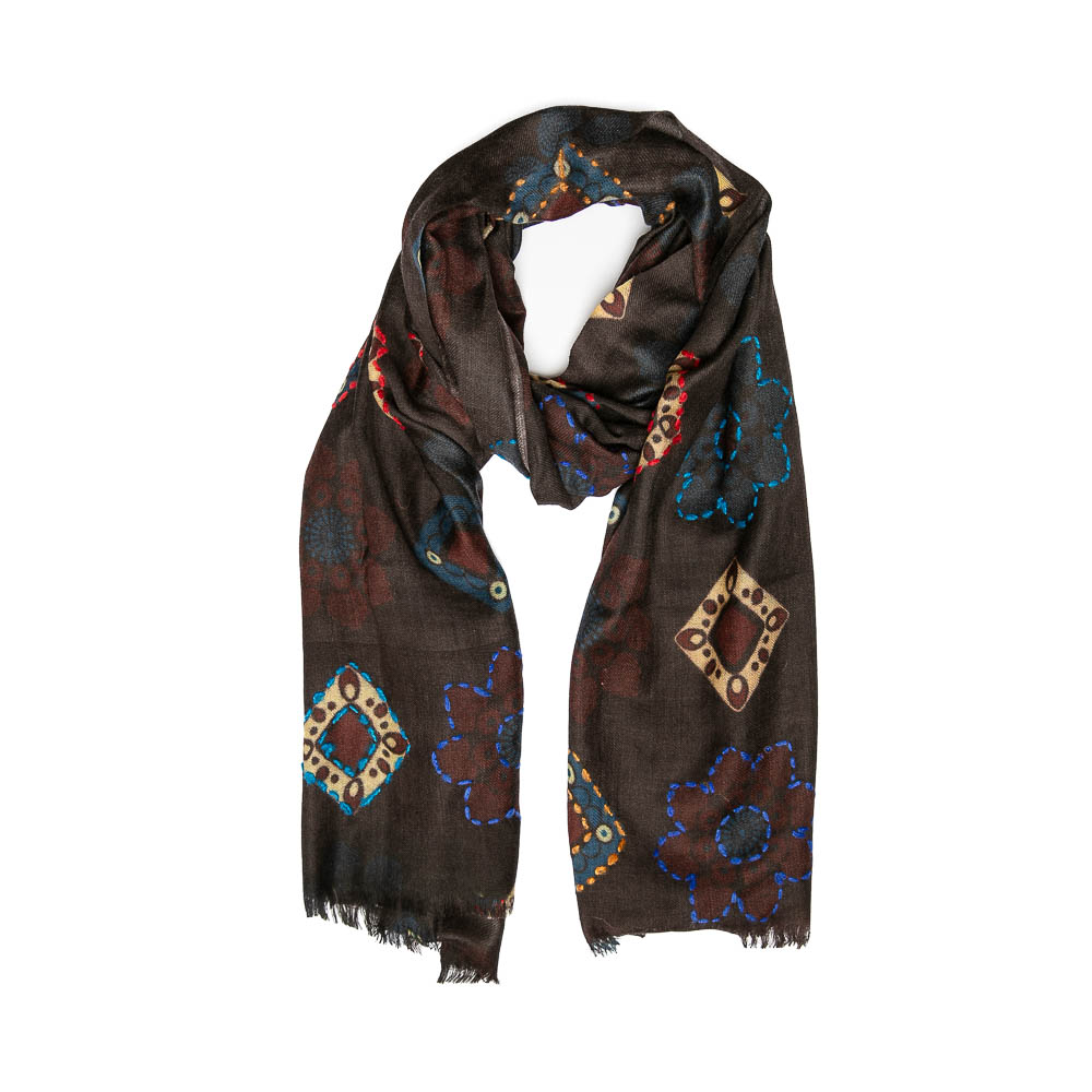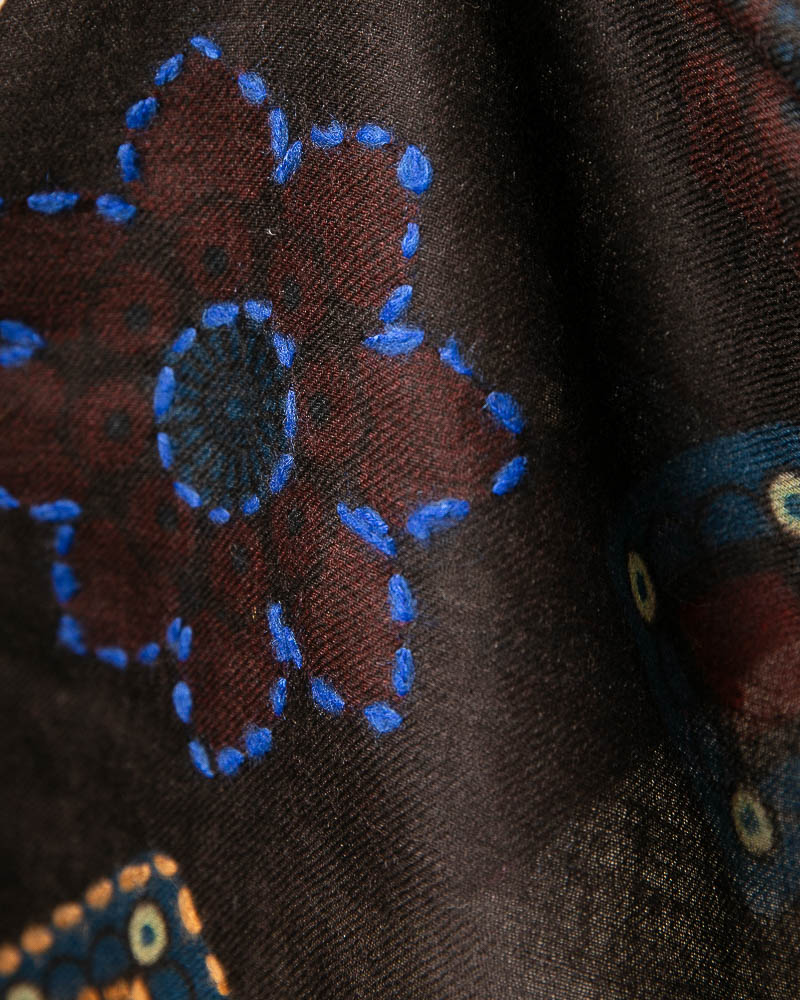 Sciarpa in soffice lana twill ricamata a mano, disegni geometrici e floreali arricchito dal contrasto di colori dei peculiari ricami.