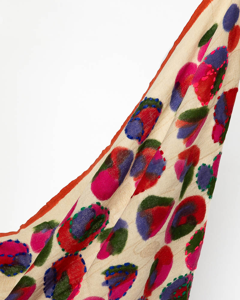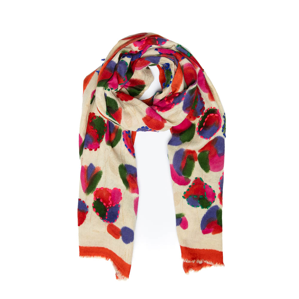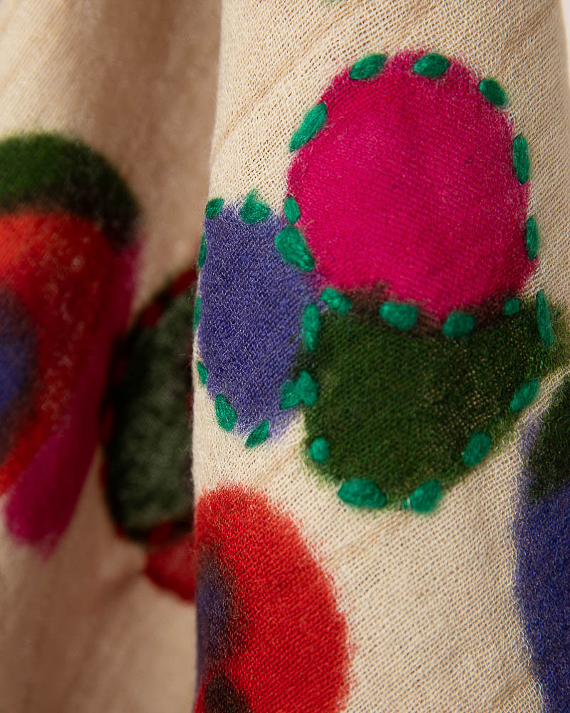 L’iconica Sciarpa Marisol, presente in ogni collezione nei colori trend della stagione, è lavorata a telaio jacquard in soffice lana merino, ricamata e dipinta a mano. Il disegno presenta piccoli papaveri arricchito dal contrasto di colori dei peculiari ricami.