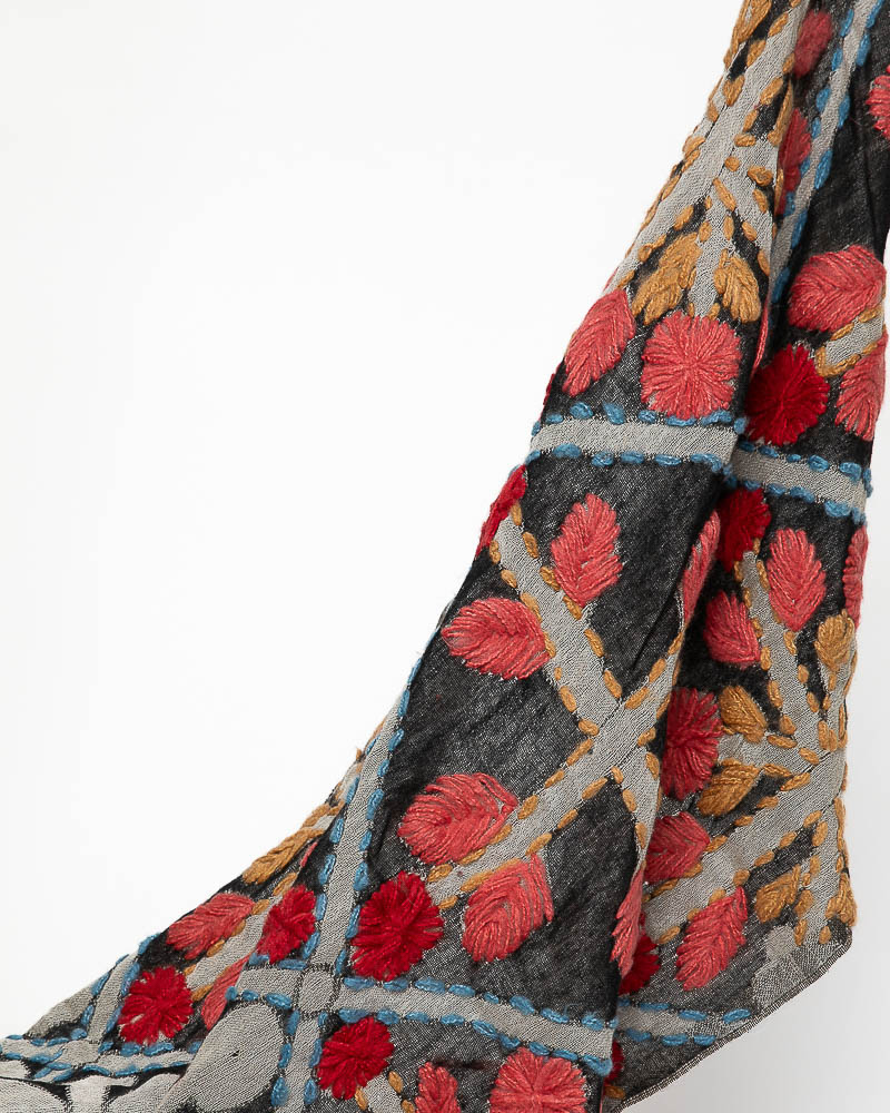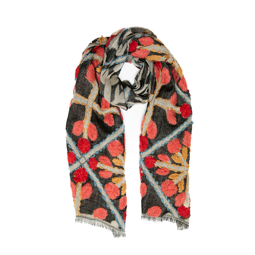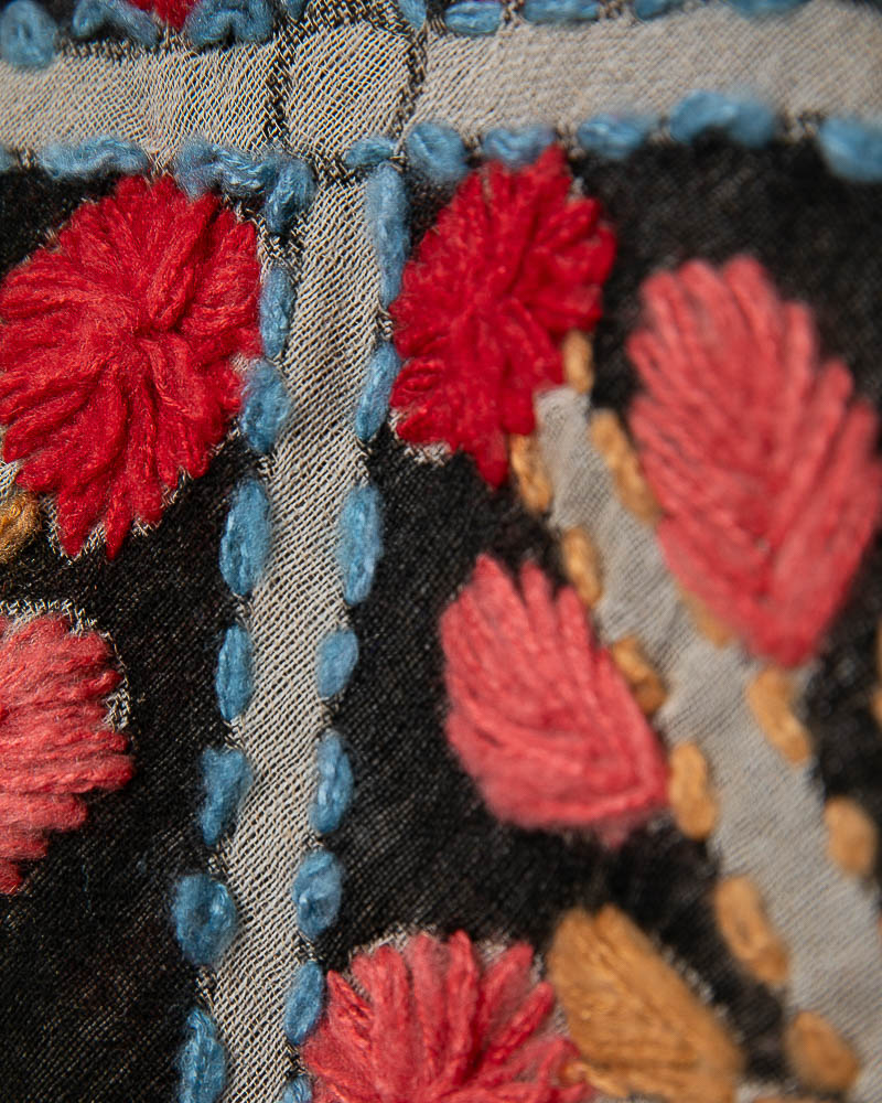 Sciarpa in soffice lana merino lavorata a telaio jacquard ed impreziosita da disegni floreali e geometrici interamente ricamati a mano, l’intera decorazione artigianale ne esalta l’unicità e la rende un capo senza tempo.